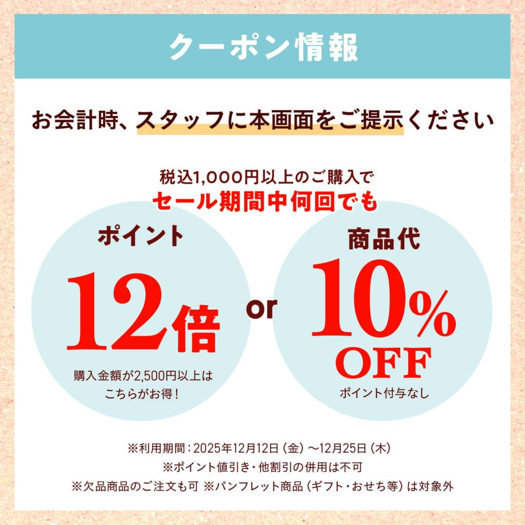 12/12(金)~25(木)までウィンターセールを開催いたします♪★回数制限なし★1,000円(税込)以上のお買い上げで、ポイント12倍付与or商品代10%OFFの大チャンス♪