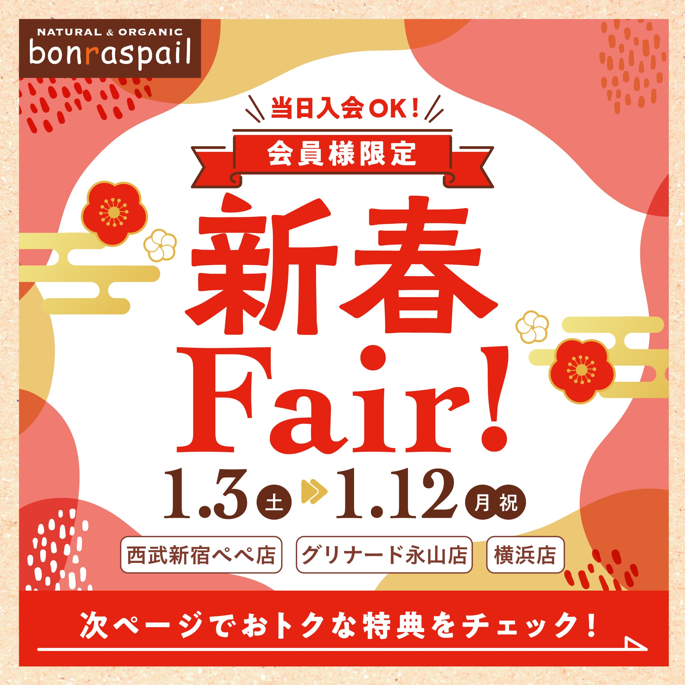 1/3(土)~12(月祝)まで新春フェアを開催いたします♪★回数制限なし★1,000円(税込)以上のお買い上げで、ポイント12倍付与&お買い上げ総額3,300円(税込)以上の方に記念品をプレゼントいたします♪