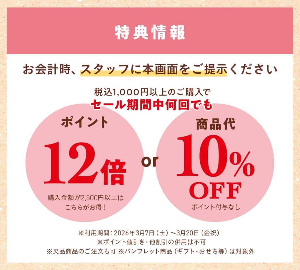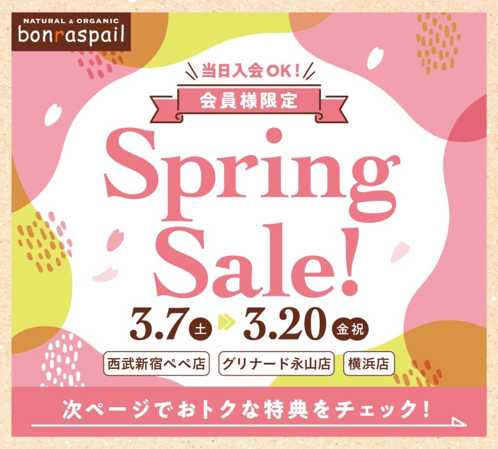スプリングセール開催! 2026.03.15 毎度ボンラスパイユをご利用いただきまして、誠にありがとうございます。3/7(金)~20(金・祝)までスプリングセールを開催いたします♪★回数制限なし★1,000円(税込)以上のお買い上げで、ポイント12倍付与or商品代10%OFFの大チャンス♪※その場で新規入会も可能です。(アプリ会員は無料で登録できます)お近くにお越しの際は新宿店、永山店、横浜店にぜひお立ち寄りください♪皆様のご来店を心よりお待ちしております!